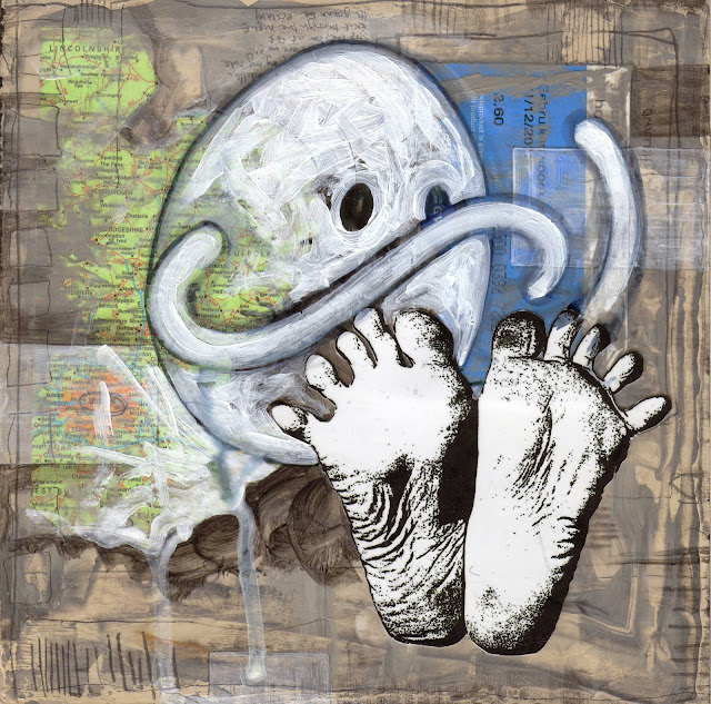 The basic premise of the project is that Adam sends out sets of four 18 x 18 cm paintings/collages (that he has started) to various artists around the world. These artists then add to the works and post them onto another artist in the group, who does likewise. Once an artist feels the work is complete they return to Adam. Eventually, when all the works have been returned, we’ll have a small show somewhere and exhibit the end results. The artists currently taking part in the project are Tony Deleon in New York, Dale Devereux Barker in Ipswich, Katie Waller in Brighton, Larry Crittenden in Texas, Irene Runayker in Eastbourne, Carmen Dominguez in California, Kunigunda Dineikaite in Lithuania, Saara Konttinen in Helsinki, Peter Scribetta in New York, Adam Monaghan in Finland and myself here in London.